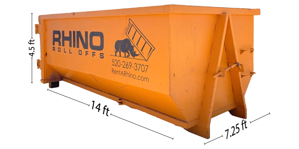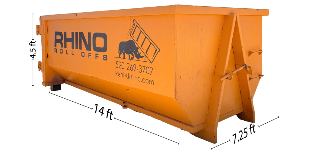 Our 15-yard roll-off dumpster rentals are designed with convenience and efficiency in mind. With dimensions of approximately 14 feet long, 7.25 feet wide, and 4.5 feet high these dumpsters are compact yet spacious enough to handle a variety of projects. Here’s why residents and businesses in Tucson choose us: